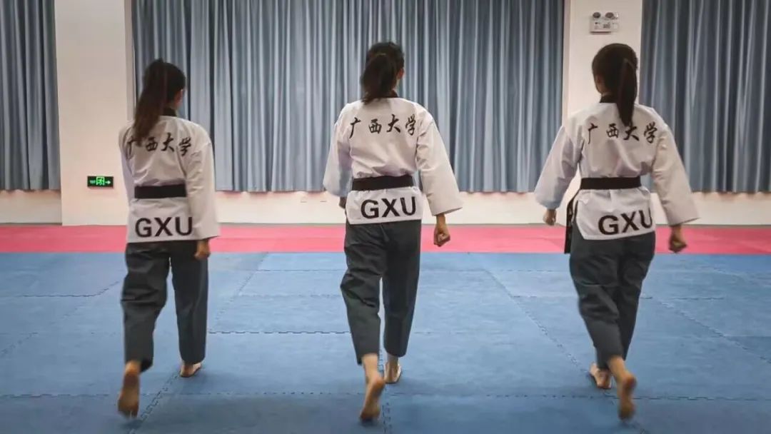 一招一式饱满有力,一拳一脚稳如泰山,一摆首一转身飒爽英姿。架势间凸显了广西大学学子越战越勇的豪迈气概,眉宇间散发着永不言弃的君武精神,挥汗里奔涌着青春的朝气蓬勃。