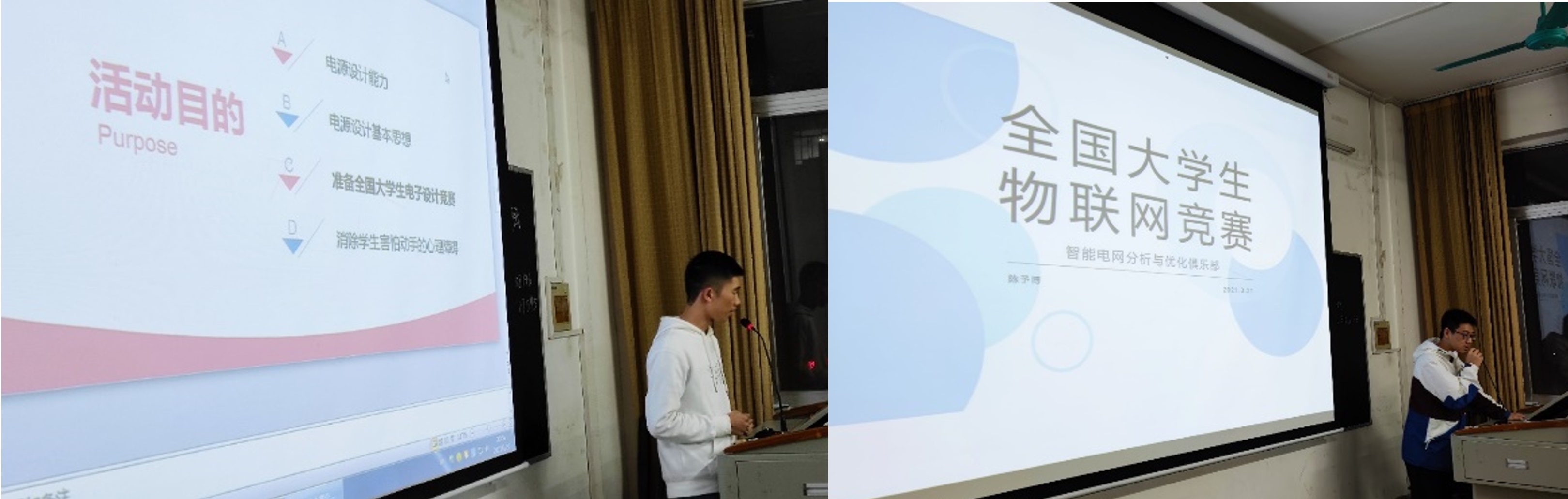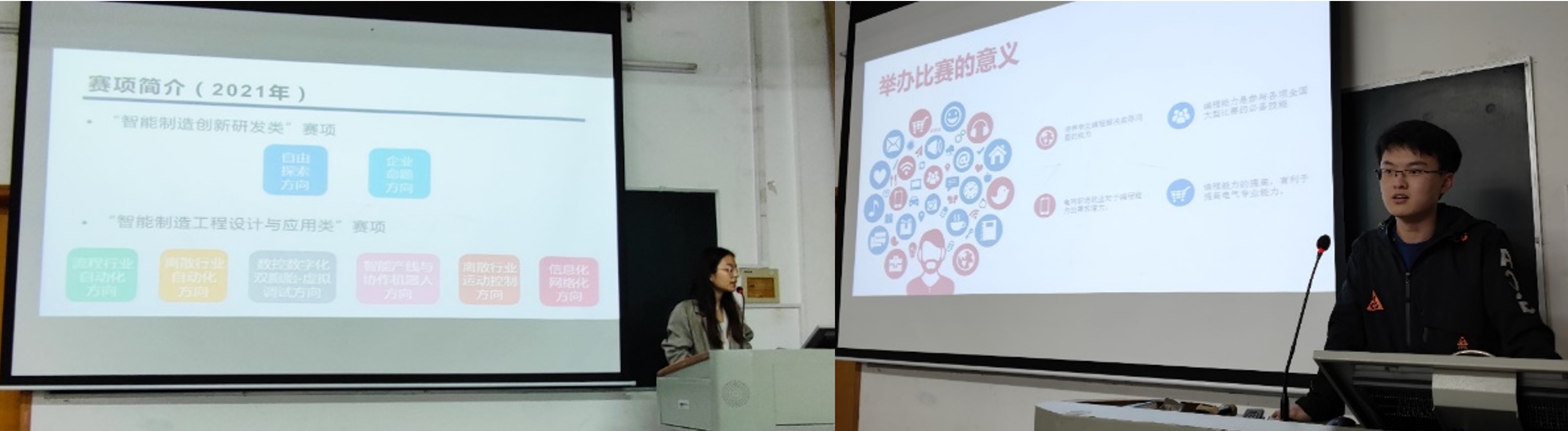 孙昕同学代表创新创业中心对“互联网+”、“挑战杯”等竞赛进行了讲解和介绍,并介绍了众创空间的创业孵化基地;姜炳旭、徐佳琪、郑静妍、陈予博、罗洪丹、莫明山、刘东端等同学分别对“全国大学生节能减排大赛”、“台达杯高校自动化设计大赛”、“学院程序设计大赛”、“西门子杯中国智能制造挑战赛”、“全国大学生物联网竞赛”、“学院工程软件设计大赛”、“学院电源设计大赛竞赛”、“学院潮流计算竞赛”等各类“双创”大赛进行了宣讲动员和经验分享。通过分享为同学们展示了创新创业赛事的多元可能性,使同学们认识到了电气工程与自动化专业知识储备在竞赛中的重要性,加强了同学们的创新精神和创业意识。