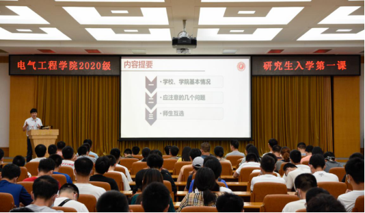 2020年9月19日晚,电气工程学院2020级研究生“开学第一课在君武楼玉林厅开讲,由电气工程学院副院长刘辉教授主讲,辅导员孙晓黎老师主持,研究生秘书韦一萍、辅导员李娟老师和全体2020级研究生一同参加会议。