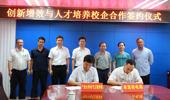 座谈会后,电气工程学院党委副书记梁志坚和来宾供电局总经理蒙恩代表双方在校企合作协议上签字。