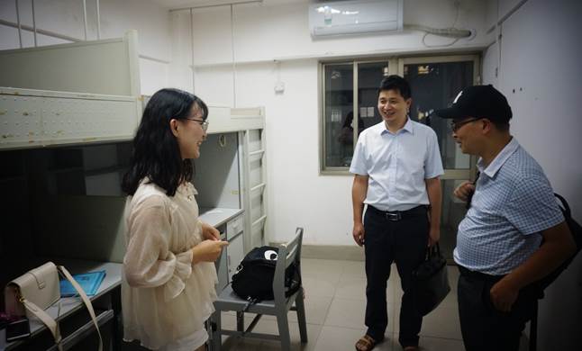 双院长、刘副院长一行先后来到西23栋、南区1栋、2栋学生公寓探望新生,亲切地与同学和家长们交谈,了解大家的家乡、学业和报道手续等情况,并对大家提出的问题给予了热情的解答