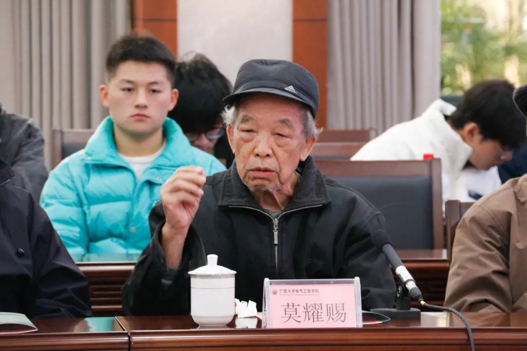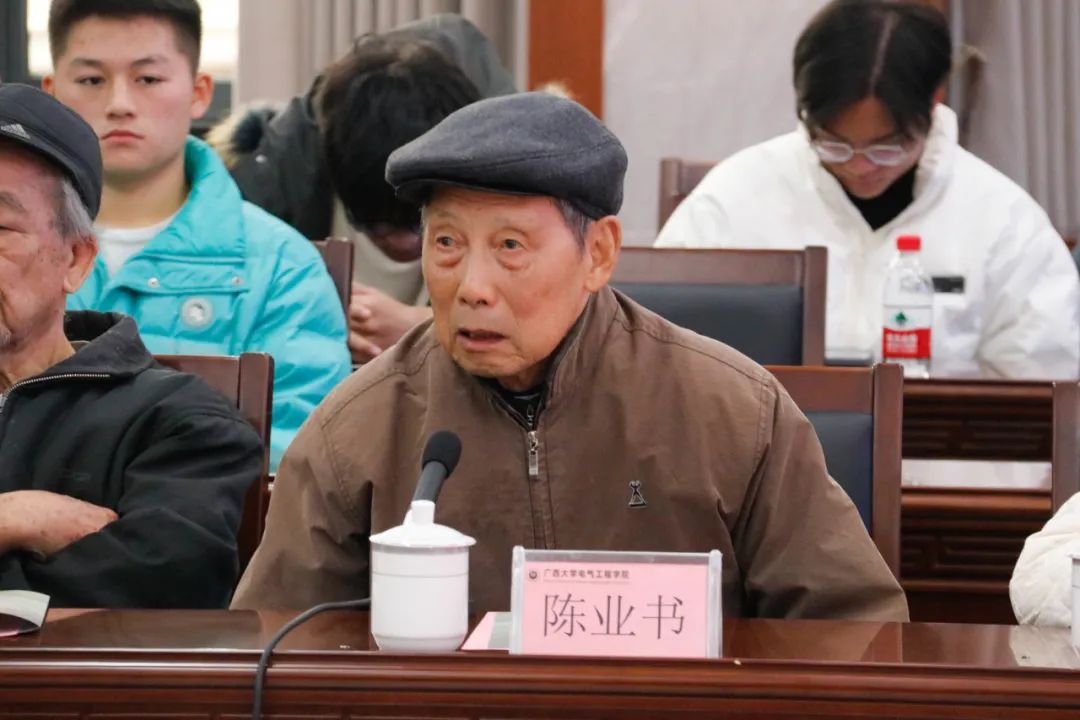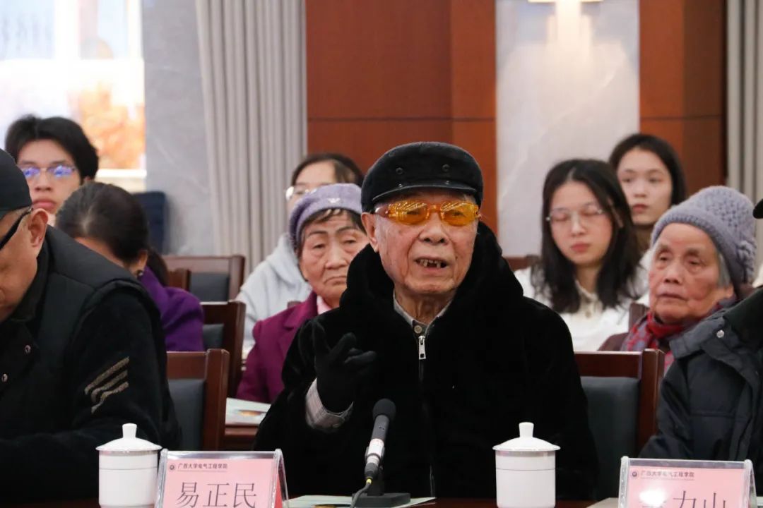 在座谈进行中,学院74级校友,原广西科协党组书记甘向群同志因故不能与会,委托学院领导宣读了他写给唐教授的感恩肺腑之言;播放了华中科技大学退休老教师陈德树教授和浙江大学电气学院的周浩教授发来视频,讲述他们各自与唐兴祚教授在工作中交往的经历,并表达了对唐教授深切的缅怀。
