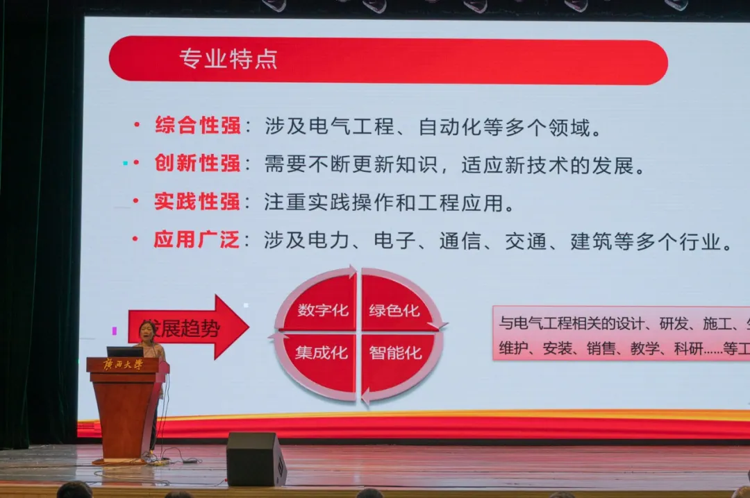 首先,电气工程系主任陈碧云老师从专业定义和专业特点两方面向同学们介绍电气工程及其自动化专业。她指出,电气工程及其自动化是一个综合性强创新性强,注重实践和工程应用并且应用非常广泛的学科。她非常欢迎大家选择这个专业作为自己的未来学习和工作的方向。