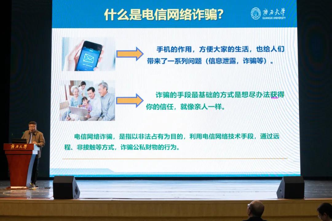 此外,本次大会邀请了广西大学保卫处金中州老师向与会师生进行反诈安全教育。他向大家详细介绍校园高发的诈骗类型和手法,让同学们对诈骗行为有了更为清晰的认识。金老师强调,诈骗分子往往利用人们的贪念、好奇心或同情心进行作案,同学们在日常生活中要提高警惕,不轻信他人。