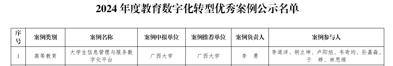 近日,广西壮族自治区教育厅公布了2024年度教育数字化转型优秀案例名单,我院报送的《大学生信息管理与服务数字化平台》入选优秀案例。