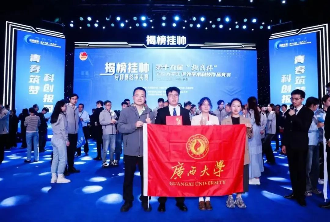 我院高放教授、代伟副教授和物理科学与工程技术学院韦克金副教授指导的学生代表队,在第十九届“挑战杯”全国大学生课外学术科技作品竞赛中获全国特等奖,这是广西大学首次,同时也是本届竞赛广西唯一的一项特等奖。