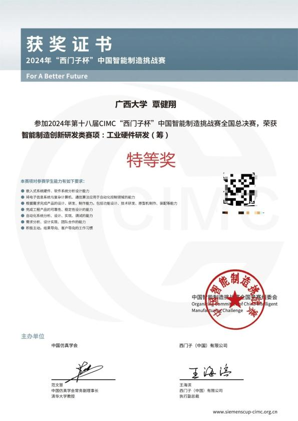 我院研究生在2024年CIMC“西门子杯”中国智能制造挑战赛中,首次在智能制造创新研发类赛项:工业硬件研发(筹)赛项中斩获全国特等奖