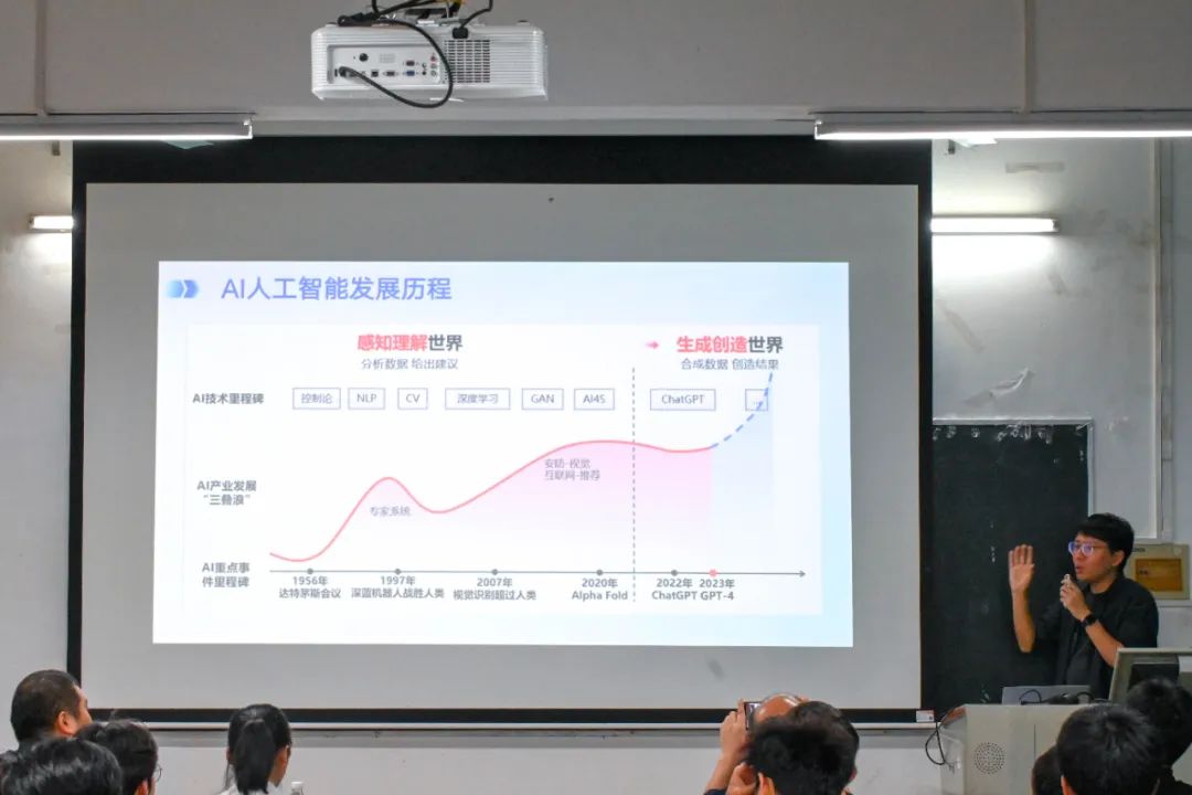 随后,张亮老师详细阐述了AI在学习、办公、编程和职业发展中的实际作用和应用方式,并期待AI成为同学们校园生活的智能助手。