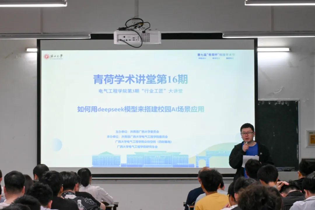 为引导同学们学习人工智能领域前沿,了解校园AI场景应用的搭建方法及其实践意义,3月27日晚上,由共青团广西大学委员会主办,电气工程学院团委、众创空间联合承办的第16期青荷学术讲堂暨第3期电气工程学院“行业工匠”大讲堂在304教室举行。