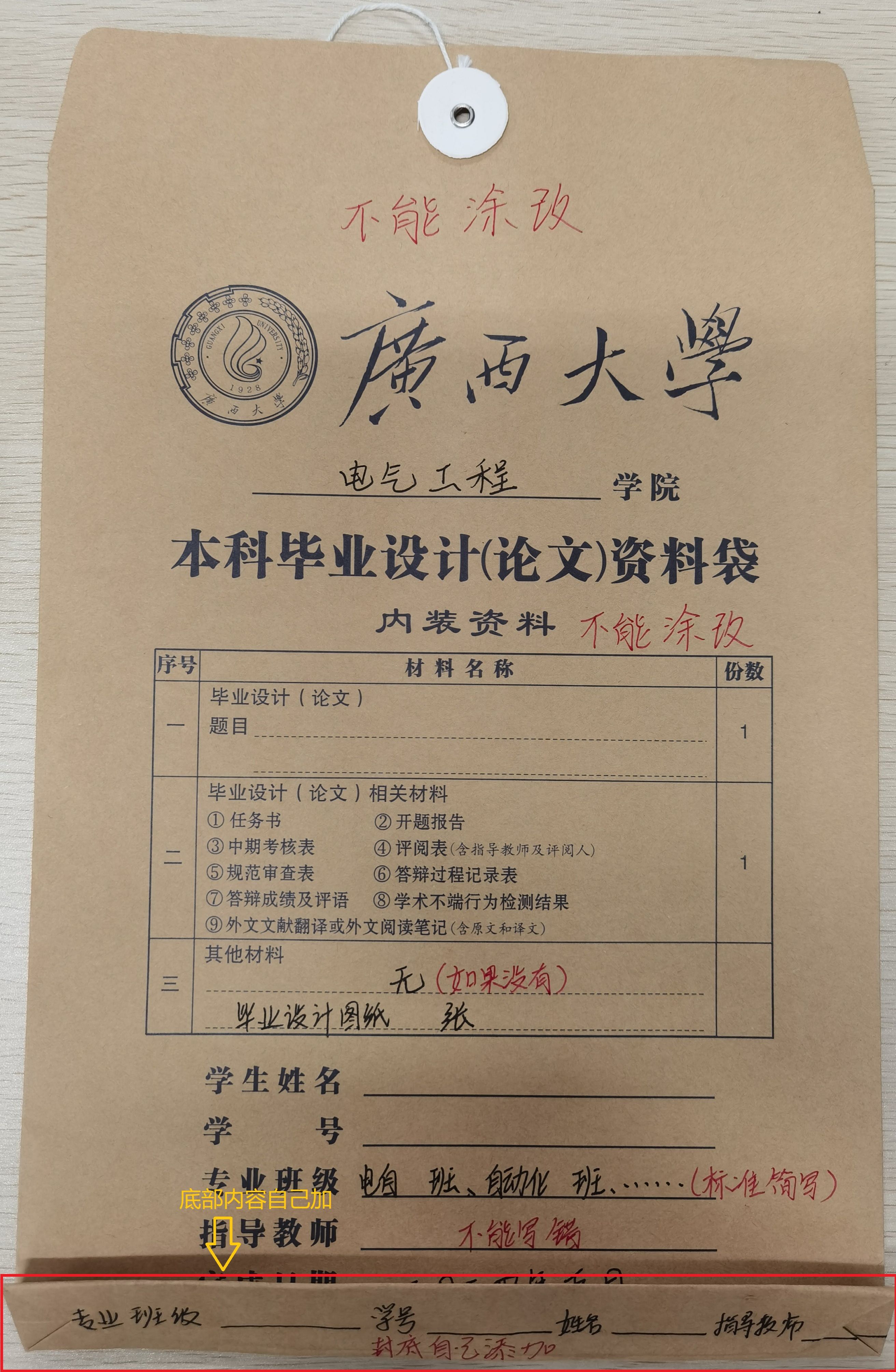 1、各班班长到104领回资料袋,同学自行整理,装袋。资料袋封面填写内容不能涂改。