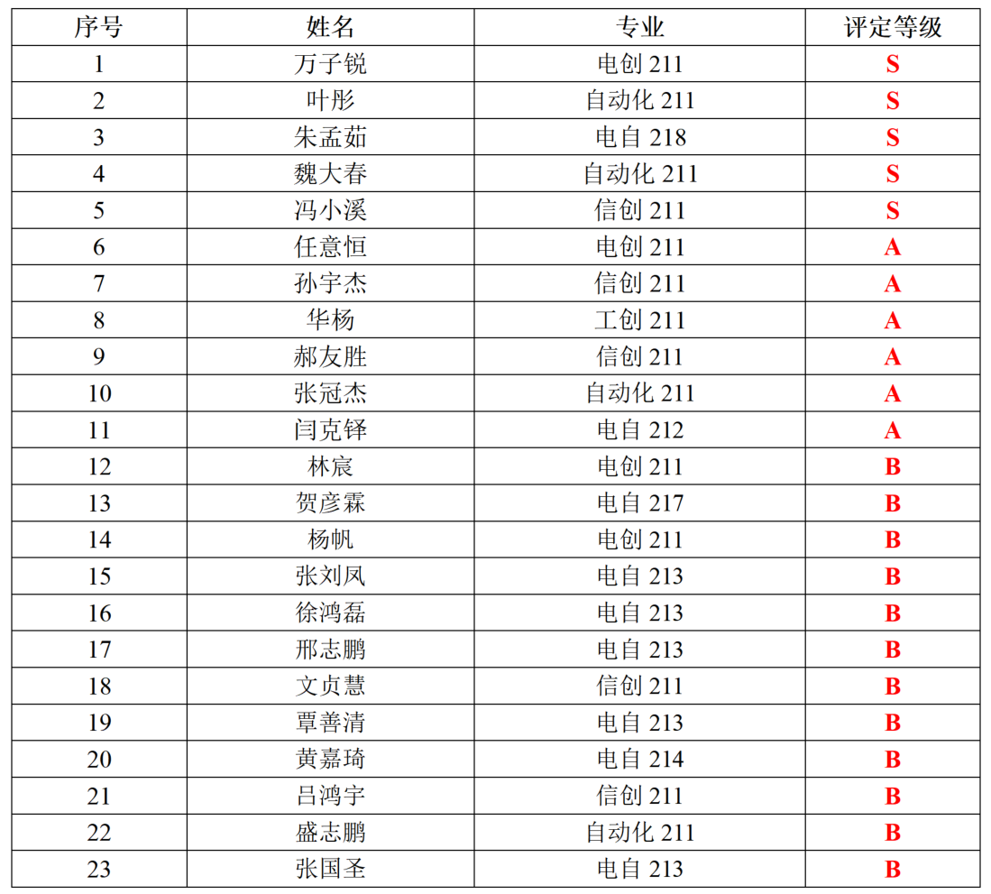 为提高我院大学生创意、创新、创造、创业的“四创”能力和水平,增强大学生的科技创新和社会实践能力,同时为用人单位招聘优秀人才和校内评优评先工作提供参考,我院组织了2024年学生的专业水平评价工作,经过学生自主申请,学院“四创”教研室、众创空间和专家组依据电气工程学院学生专业水平评价细则(电行政〔202110号)文件对申请材料审核,经过由学生代表、辅导员及“四创”教研室教师组成的评审小组投票和综合评定,确定通过专业水平评价证书的同学名单及评定等级,结果如下: