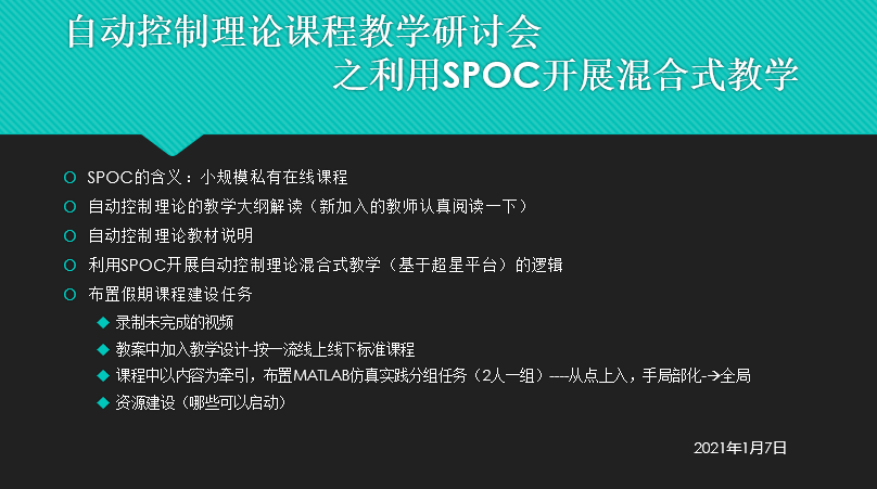 为顺利开展2021-2022(2)学期自动控制理论课的教学,2022年1月7日上午10点在学院312召开了关于自动控制理论课程利用SPOC开展混合式教学的教学研讨会和培训会,会议讨论了春季学期开课全体任课教师如何采用SPOC开展教学,特别是胡立坤老师就前期探索中遇到的问题与大家进行了交流,同时初步布置了假期课程建设的任务。会议会对广西大学慕课平台如何高效使用进行了培训。