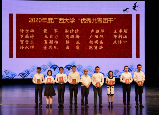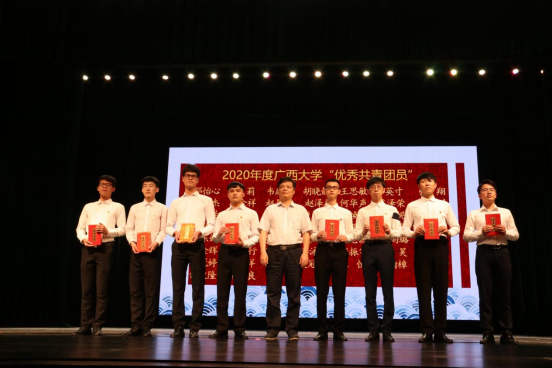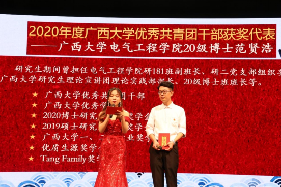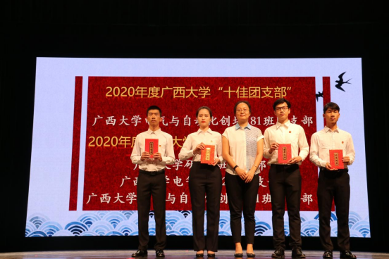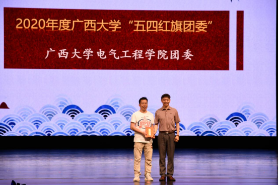 晚会现场表彰了2020年度学校团委评选出的五四红旗团委、五四红旗团支部、十佳团支部、优秀共青团员、优秀共青团干部的先进集体和优秀个人。2020年度电气工程学院团委被评为“广西大学五四红旗团委”,创培181班团支部被评为“广西大学十佳团支部”,电气研193班团支部、电气类192班团支部、创培181班团支部被评为“广西大学五四红旗团支部”,并且学院有51人获评“广西大学优秀共青团员”、19人获评“广西大学优秀共青团干”。