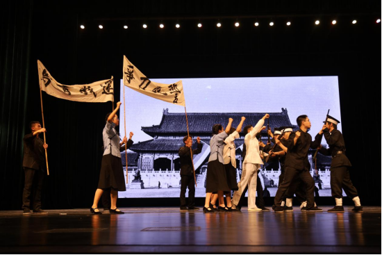晚会的最后,演职人员挥动着国旗走上舞台,高声齐唱《我们都是追梦人》,伴着激昂的音乐,现场青春洋溢,同学们高呼着我们都是追梦人的青春宣言。