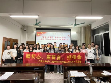 为深入学习贯彻党的二十大精神,引导党员同志坚定理想信念、牢记初心使命,增强青年党员的荣誉感和使命感,3月25日晚,电气工程学院本科生第三党支部在学院304开展以“重温入党誓词,争做合格党员”为主题的党日活动暨预备党员入党宣誓仪式。活动由支部副书记邹然主持,支部全体党员参加。
