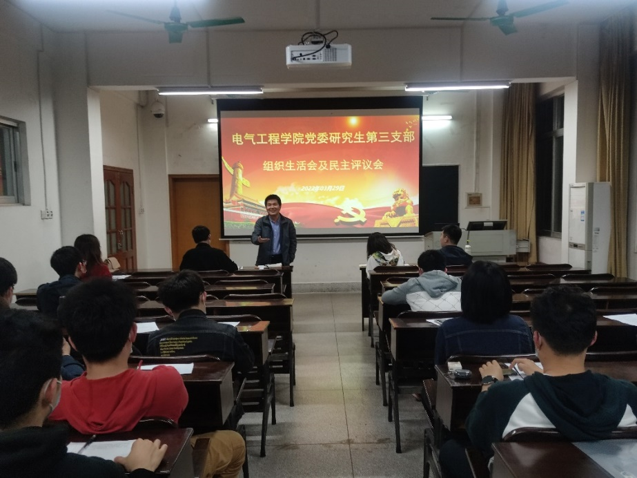 为深入学习贯彻党的十九届六中全会精神,不断推进党的建设新的伟大工程,2022年3月29日晚,开云kaiyun登录入口研究生第三党支部组织开展了党支部组织生活民主评议党员大会与研究生党员素质教育活动。支部党员34人参加本次活动,由支部委员罗尹政负责主持工作,胡立坤副院长莅临现场观摩。